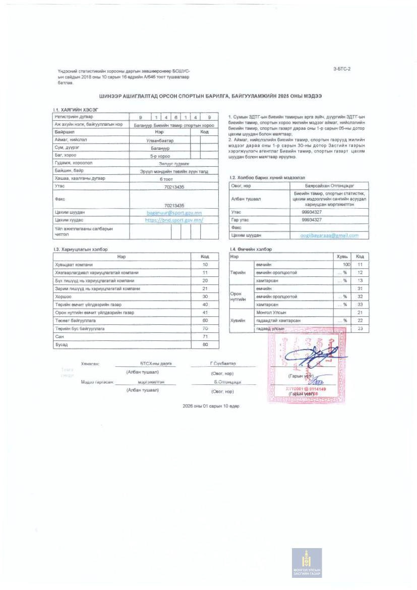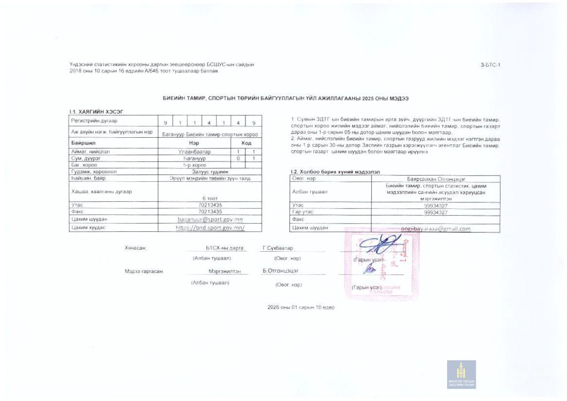 ДЭЛГЭРЭНГҮЙ МЭДЭЭЛЭЛ АВАХ ЭХ СУРВАЛЖ:Багануур дүүргийн Биеийн тамир, спортын хорооны тогтоол шийдвэр,тайлан мэдээ, хүний нөөц хариуцсан мэргэжилтан: Э.ТулгааУтас: 89884944Цахим хаяг: tulgaa8808@yahoo.com