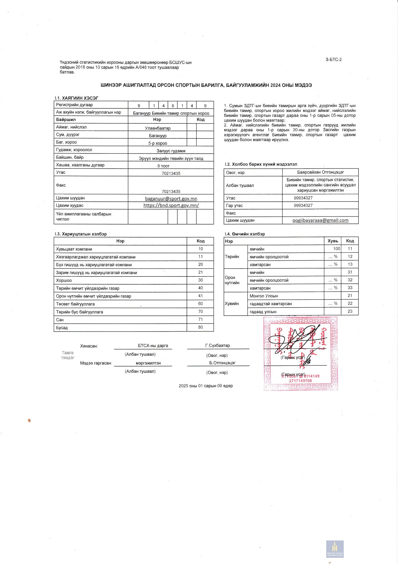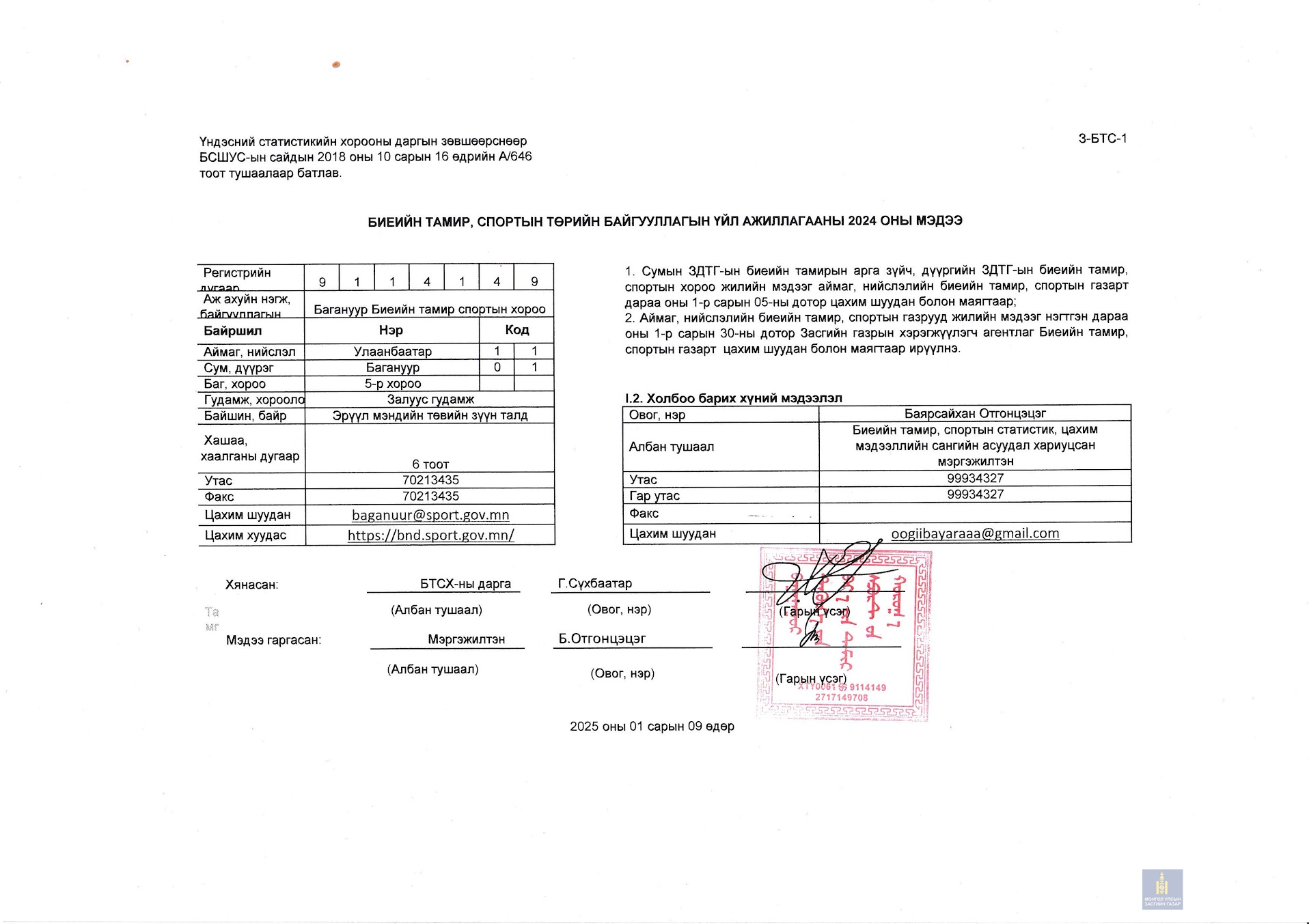 ДЭЛГЭРЭНГҮЙ МЭДЭЭЛЭЛ АВАХ ЭХ СУРВАЛЖ:Багануур дүүргийн Биеийн тамир, статсистик цахим мэдээллийнсангийн асуудал хариуцсан мэргэжилтан: Б.ОтгонцэцэгУтас: 99934327Цахим хаяг: oogiibayaraaa@gmail.com