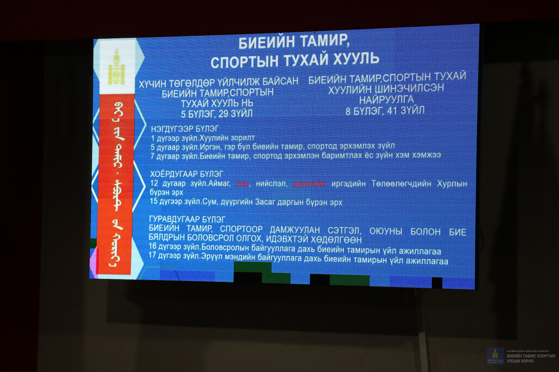 Тус танилцуулгын үеэр "Биеийн тамир, спортын тухай хууль"-ийн гарын авлага бэлтгэж оролцсон байгууллагын удирдлага нарт тараалаа.